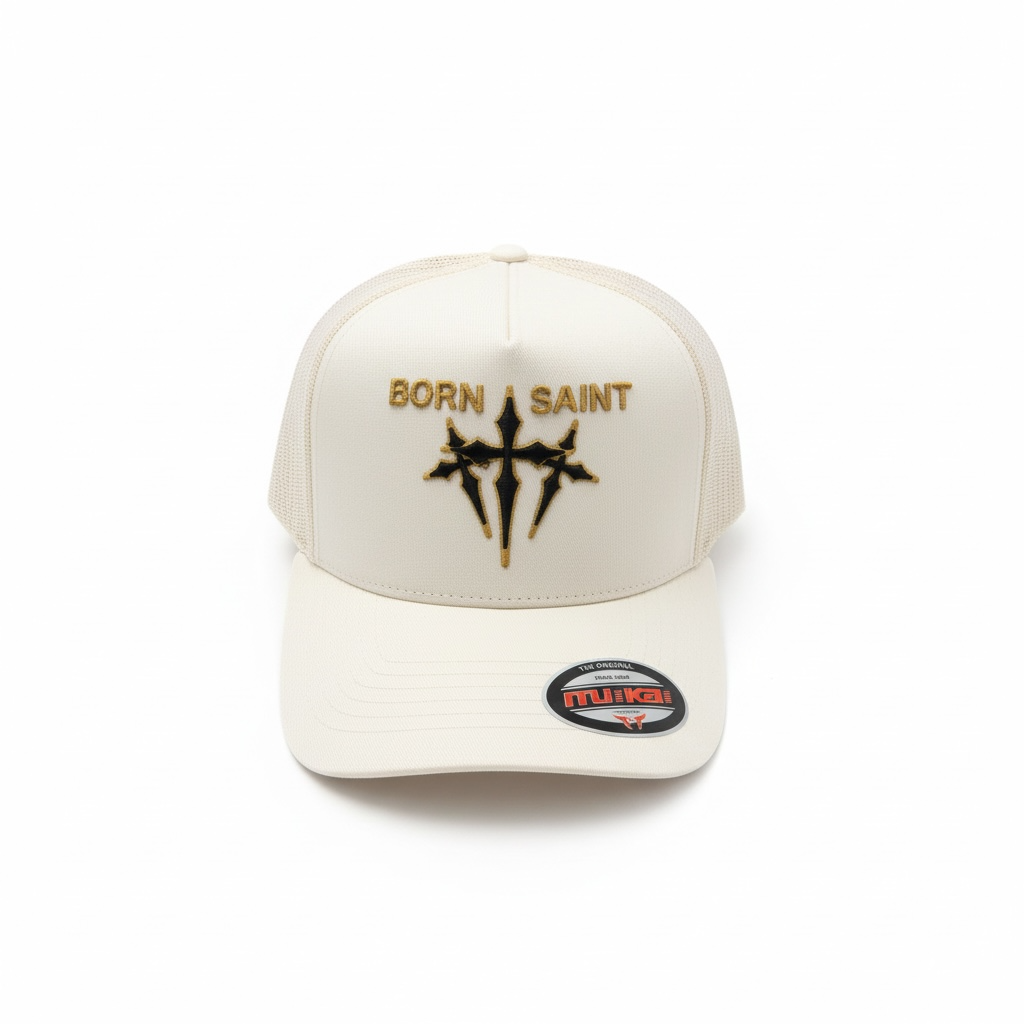 MUKA 'Born Saint' Trucker Hat (Ivory) T5485B