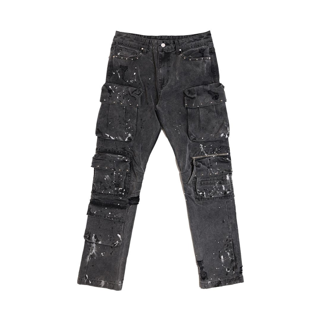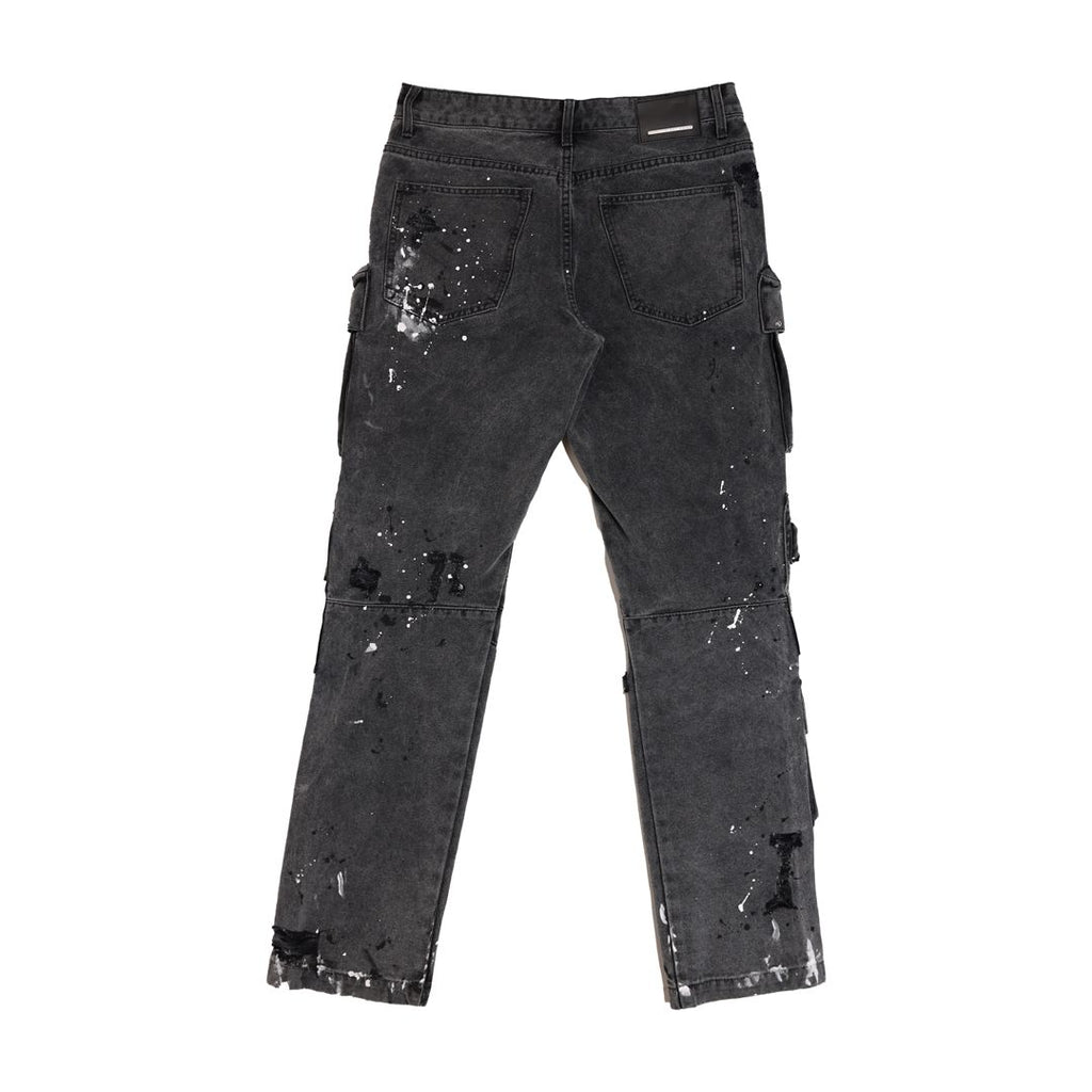 A slim fit cargo pants featuring studs, paint splatter detail, cargo pockets, classic 5 pocket construction and zip-fly closure.