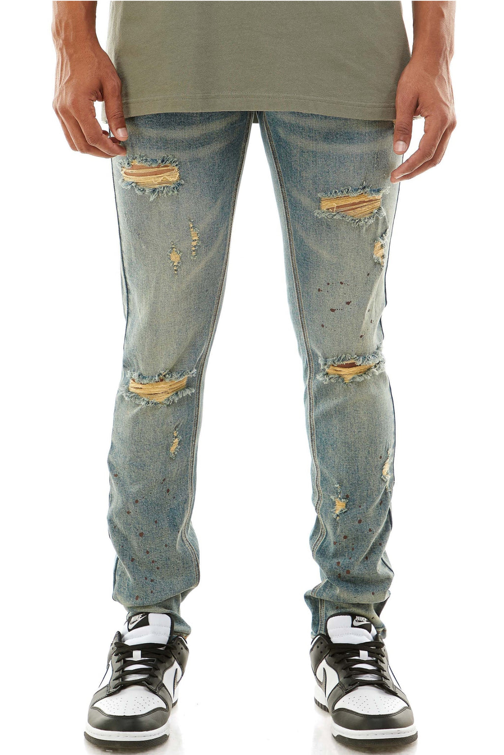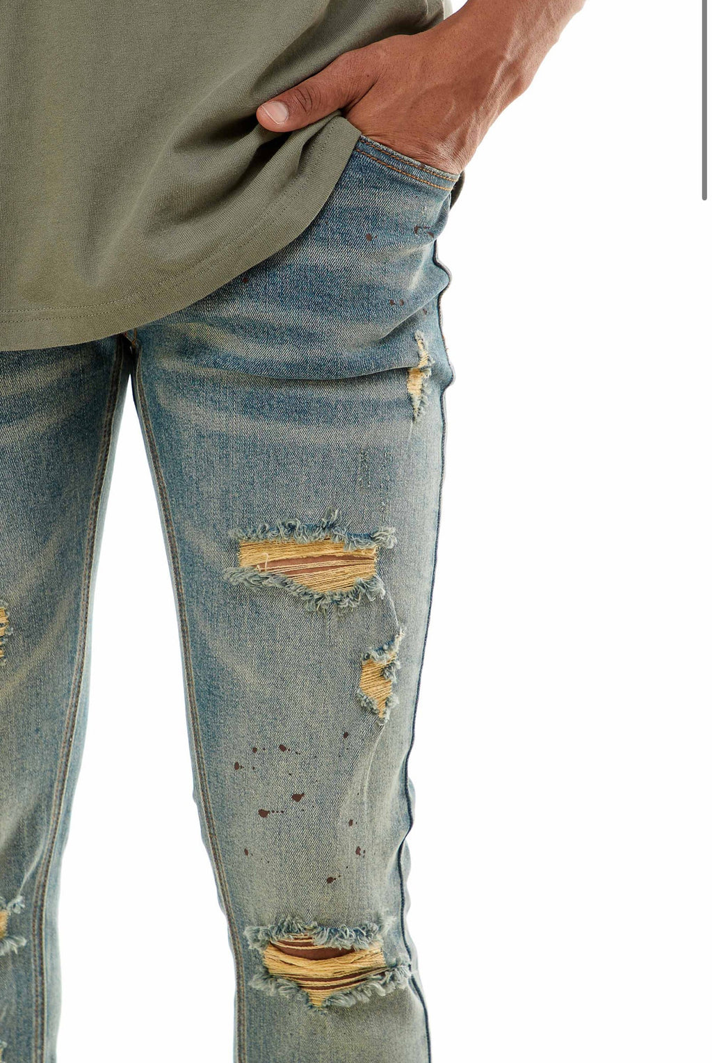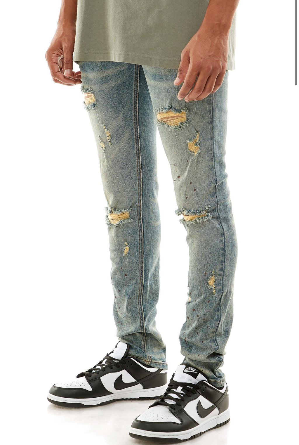 • Multiple rips on the front w/ denim patches inside