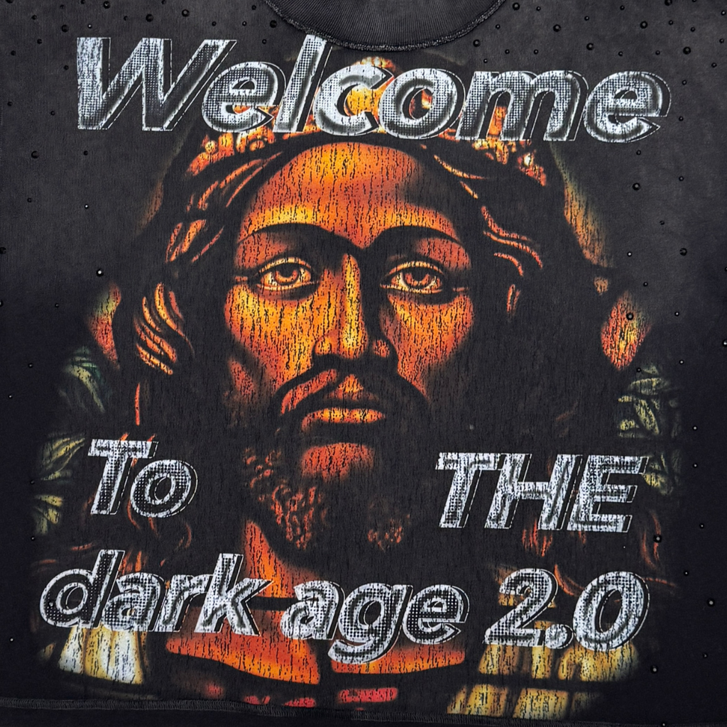 Make a bold statement with the Rare Peace “Welcome To The Dark Age 2.0” Oversized Rhinestone Cropped T-Shirt in Black (Style RT5053). Designed with an oversized cropped fit, this tee features a washed digi print, welding paint details, and rhinestone accents for a layered, textured look.