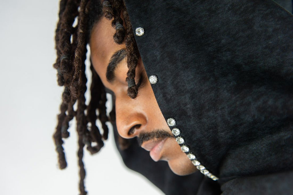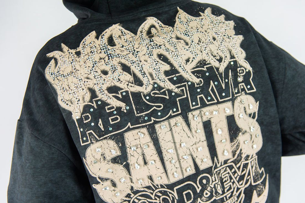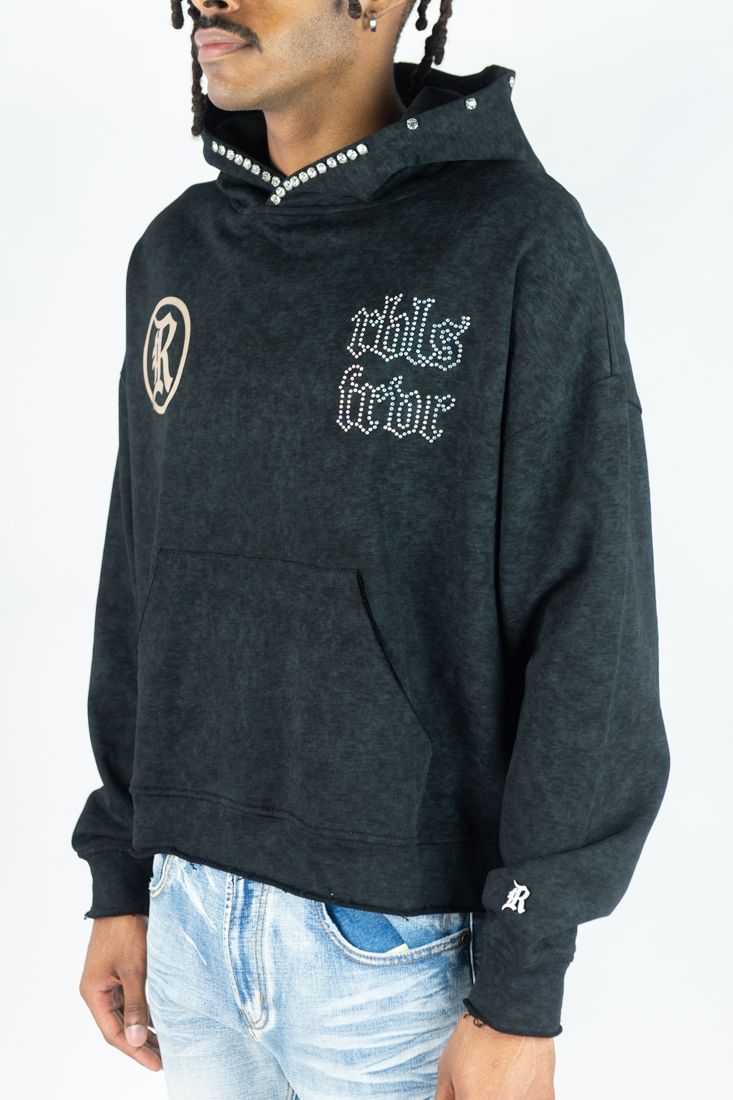Stand out with bold streetwear energy in the Rebel Denim “Sinner” Cropped Hoodie, designed in classic Black with premium mineral wash and custom rhinestone embellishment. Built with a cropped oversized fit, this pullover hoodie brings modern silhouette, texture, and shine to streetwear outfits.