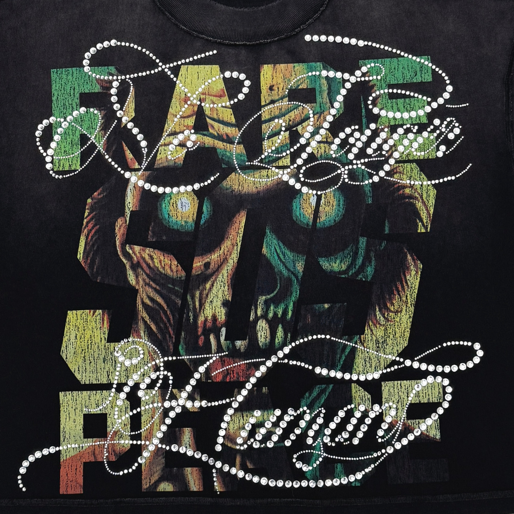 Bring dark art, luxury shine, and bold street style together with the Rare Peace “No Longer Human (Zombie)” Oversized Rhinestone Cropped T-Shirt. Designed in a deep black finish and highlighted with premium rhinestone graphics, this statement piece blends futuristic streetwear aesthetics with gothic-inspired artwork.