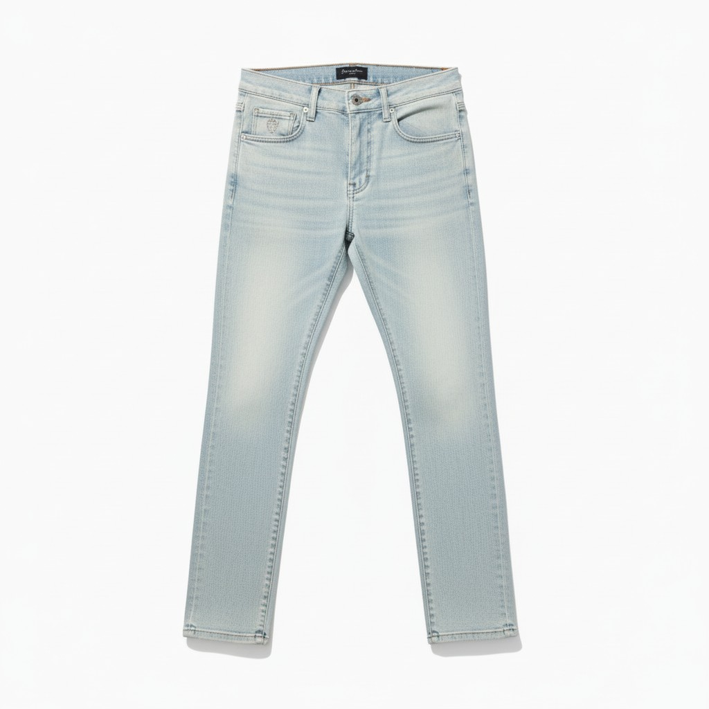 Skinny fit jeans are characterized by their very tight, form-fitting design, hugging the body from waist to ankle, often with a narrow leg opening. They are typically made with stretchy materials like cotton and elastane for a snug, second-skin feel