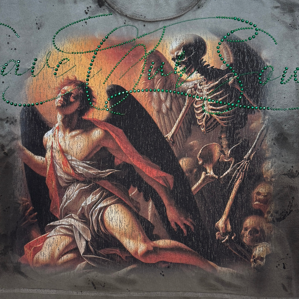 The “Save Our Souls” graphic captures cyber-industrial energy, blending metallic print effects with reflective stones to create a luxury streetwear look that stands out from standard graphic tees. Its relaxed oversized body offers comfort and structure, while the cropped cut makes it ideal for pairing with stacked denim, cargos, sweats, and puff outerwear.